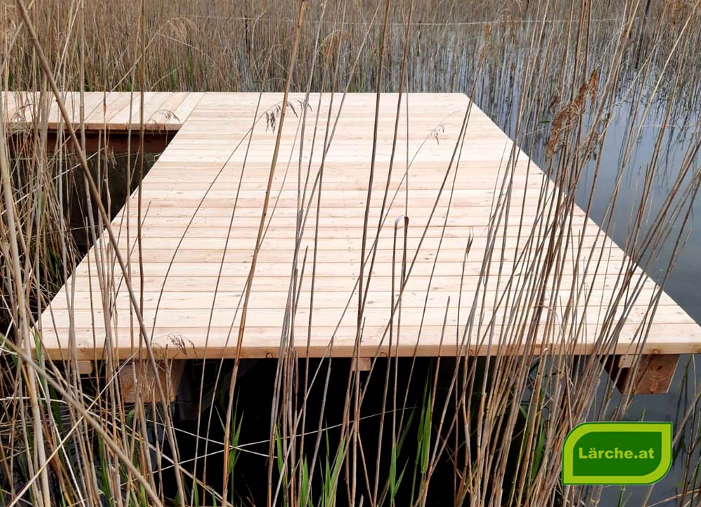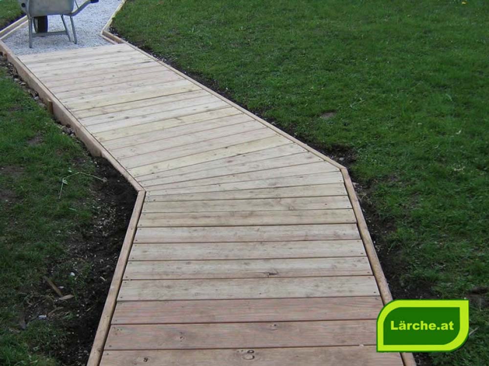 Lärchenholz eignet sich im Außenbereich – und natürlich auch innen – für die unterschiedlichsten Anwendungen. So dient es nicht nur für Terrassen, sondern ebenso für den Wegebau. Das kann ein schöner und vielleicht geschwungener Gartenweg sein, eine Brücke über einen Wasserlauf oder sogar ein Badesteg in einen Teich.